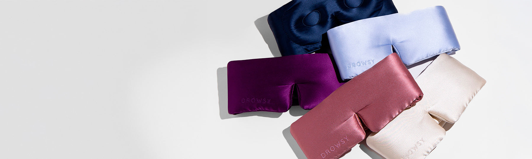 Save £21.00 The Purple Martini silk sleep mask by drowsysleepco features a deep purple shade, wide blackout design, and nose cutout for comfort—perfect for uninterrupted beauty sleep. DROWSY is embossed on the lower left corner.Model wearing Drowsy Purple Martini Silk Sleep Mask