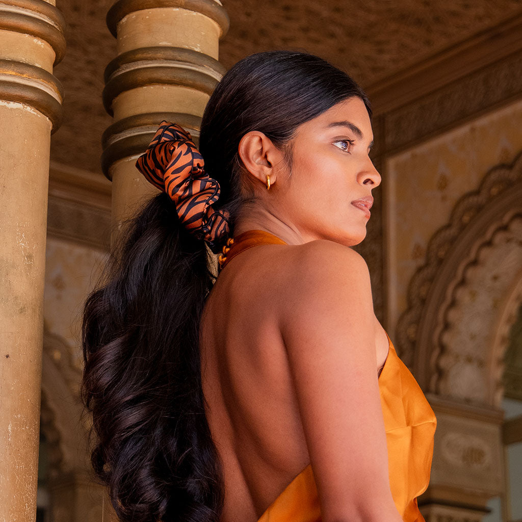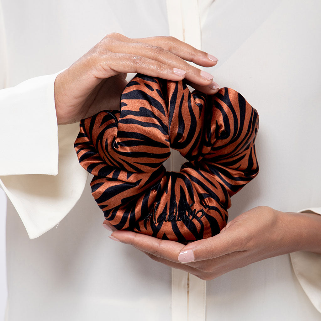 A whole new world of beauty is waiting just for you. Keep your hair protected night and day with this majestic silk scrunchie, inspired by Rajah the tiger. A true statement piece with premium padding to guarantee your princess hair stays protected.
