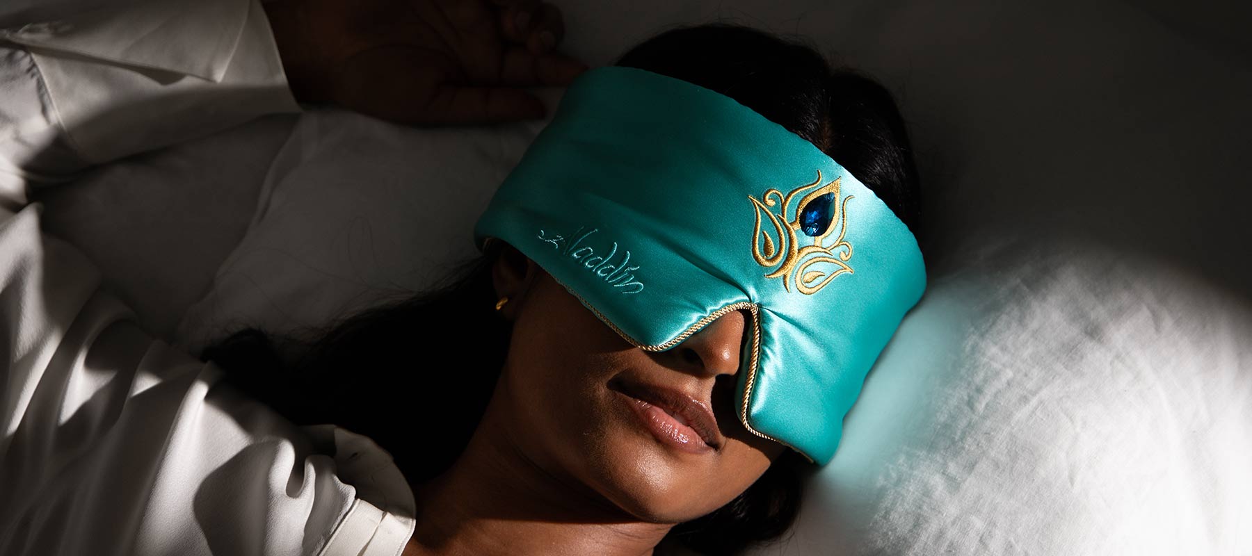 A whole new world of beauty sleep is waiting for you. With its luxury gold piping and Jasmine-inspired gemstone, this silk eye mask is the epitome of elegance. Wrap yourself in rich, turquoise silk and drift asleep in total darkness. At last, a beauty ritual that works like magic. Fall asleep and wake up glowing like a princess.